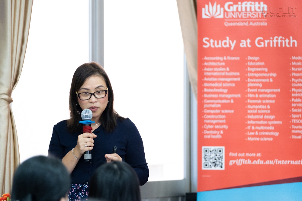 Mở đầu buổi hội thảo, cô Michelle Hoang Walker – Đại diện tuyển sinh khu vực của trường Đại học Griffith đã cung cấp một số thông tin về ưu đãi dành cho sinh viên HUFLIT khi chọn du học tại Griffith. Cụ thể, nếu sinh viên nhập học theo dạng chuyển tiếp từ HUFLIT, sẽ được hưởng ưu tiên chuẩn đầu vào tiếng Anh IELTS là 6.0, thay vì 6.5 đối với các đối tượng khác. Ngoài ra, đối với các sinh viên có điểm trung bình tích lũy trên 6.5 cũng sẽ có cơ hội được nhận học bổng 20 – 25% học phí toàn khóa học.