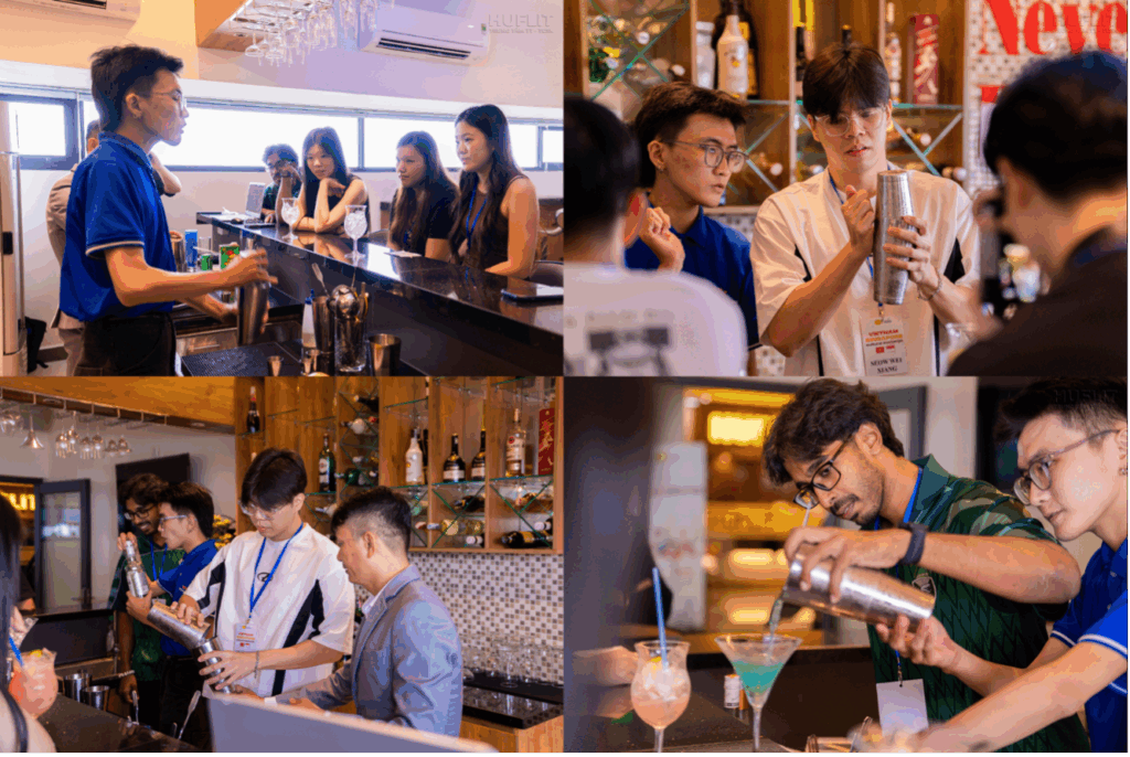 Tại quầy pha chế, các HUFLITers đã thể hiện sự chuyên nghiệp và kỹ năng nghiệp vụ một cách ấn tượng. Từ việc giới thiệu nguyên liệu, hướng dẫn từng thao tác pha chế chính xác, đến cách trình bày thức uống đẹp mắt và cân chỉnh hương vị độc đáo, tất cả đều cho thấy sự vững vàng trong kiến thức và kỹ năng nghiệp vụ.